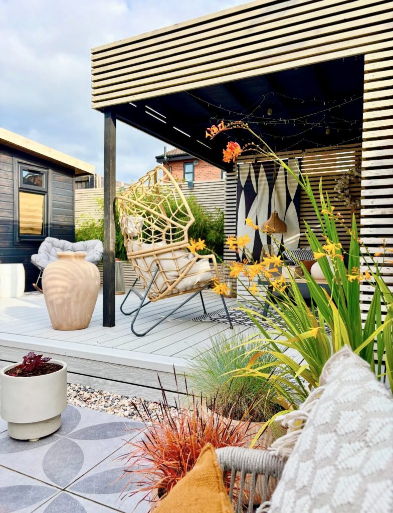 This patio is very colorful and shows a different version of a modern pergola, which combines patterned wood and modern fun seating with colorful plants. The patio has many levels with wood and tile. The patio has modern furniture and plants, which fits the 2026 goals of outdoor spaces. The style is modern and energetic and fits backyard design goals well.