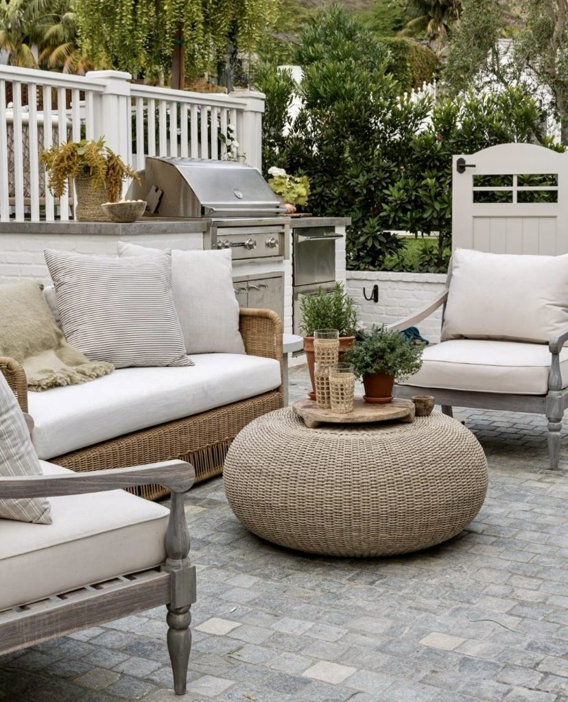 This calming lounge brings together soft woven furniture, an inviting round coffee table, and a polished built-in grill, making it an ideal example of a functional yet elevated backyard setup. The light cobblestone ground introduces subtle texture, acting as a softer alternative to heavier concrete or paver surfaces while keeping the aesthetic warm and approachable. With its mix of greenery, natural materials, and relaxed seating, the space offers wonderful ideas for homeowners who want an outdoor haven that balances comfort with everyday practicality.