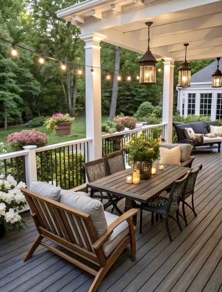 This welcoming covered deck captures the timeless American porch aesthetic with its wood-toned furniture, glowing lantern pendants, and string lights that draw the eye across the inviting outdoor dining setup overlooking a peaceful backyard. The soft railing planters add a burst of life, while the clean, elongated decking boards create a streamlined layout perfect for relaxed dinners and weekend gatherings, offering homeowners practical yet elegant ideas for backyard entertaining in 2026.