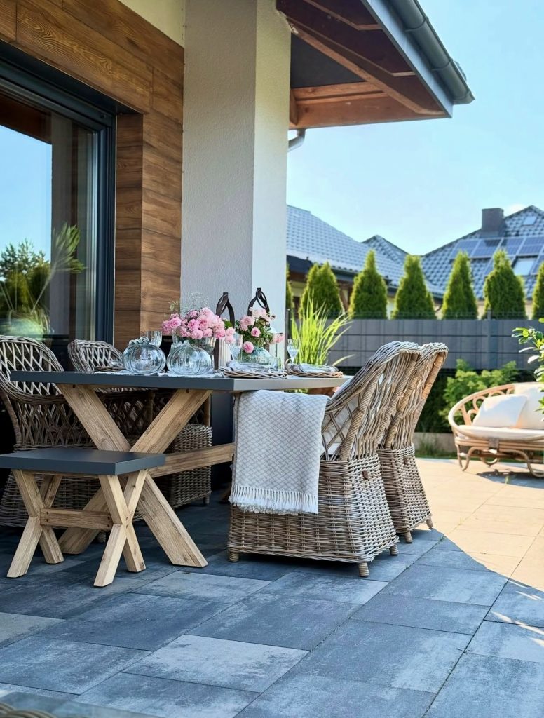 This charming patio blends rustic wicker seating with a sturdy farmhouse-style dining table set over cool-toned stone pavers, creating the perfect balance of texture and comfort for a family-friendly outdoor dining area. The thoughtful mix of soft florals, warm lanterns, and natural materials offers homeowners refined ideas for crafting intimate spaces near the front or back of the home, while the structured flooring provides long-lasting durability without leaning into heavy backyard concrete.