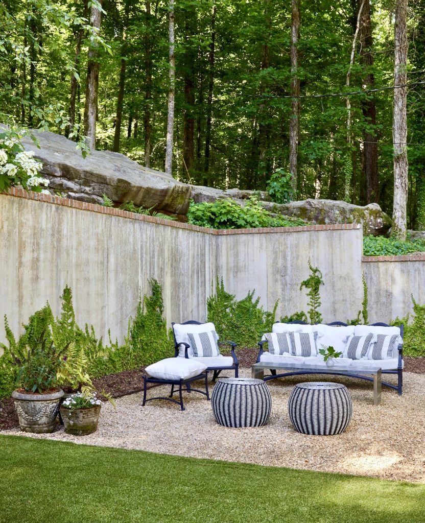 This serene lounge space sits beautifully against a dramatic natural rock wall, creating a unique connection between structured design and wild landscape—an ideal look for a backyard that borders wooded areas or sloped terrain. The gravel flooring offers a practical alternative to concrete, while navy-accented seating and rounded woven tables bring a subtle sophistication to the clean layout, offering refreshing ideas for homeowners who want a grounding, nature-forward outdoor haven.