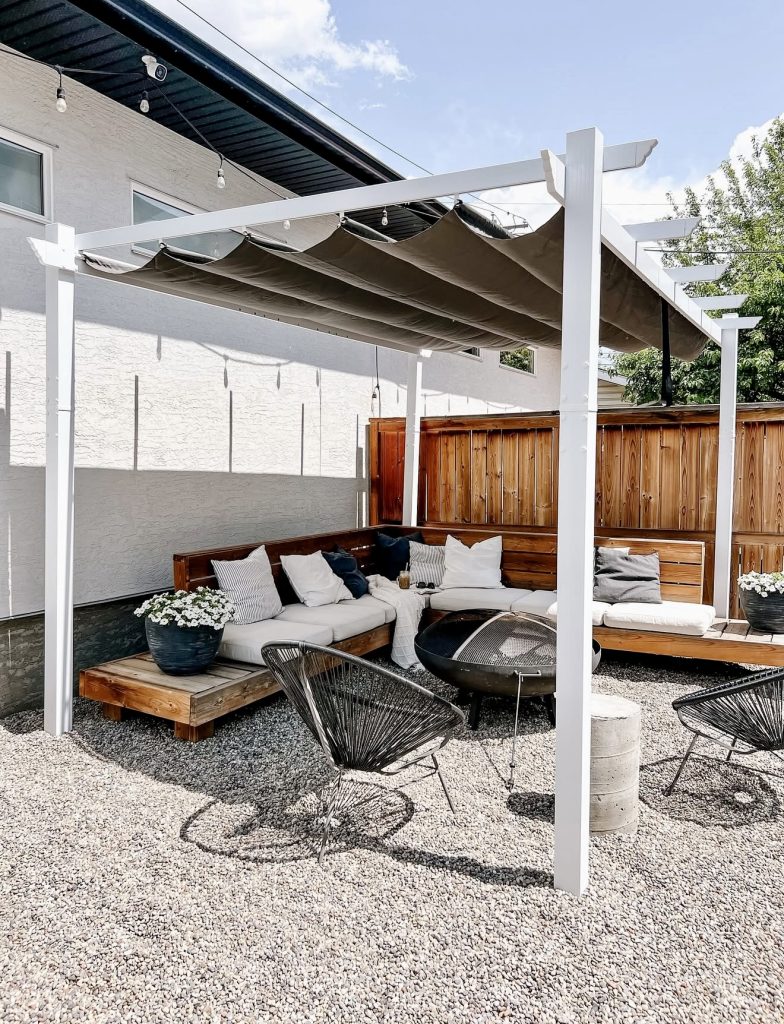 This sleek and modern patio uses clean lines, wood-toned modular benches, and a streamlined shade system to create a relaxed gathering spot, proving that even a small backyard can feel spacious with the right layout. The gravel ground is a smart alternative to backyard concrete or stamped concrete, and the cozy fire bowl encourages connection, making this space a perfect example of practical outdoor design with a fresh, airy appeal.