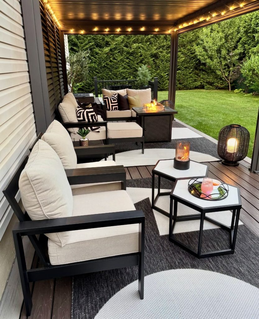 This sleek covered patio brings a contemporary edge to outdoor living with its structured black furniture, soft neutral cushions, and geometric tables layered over a mix of modern rugs that soften the space without overwhelming it. Warm string lights highlight the clean architectural lines, while the compact fire feature adds just enough glow for evening relaxation, making this a great example of smart ideas for backyard design where simplicity and comfort define the entire layout.