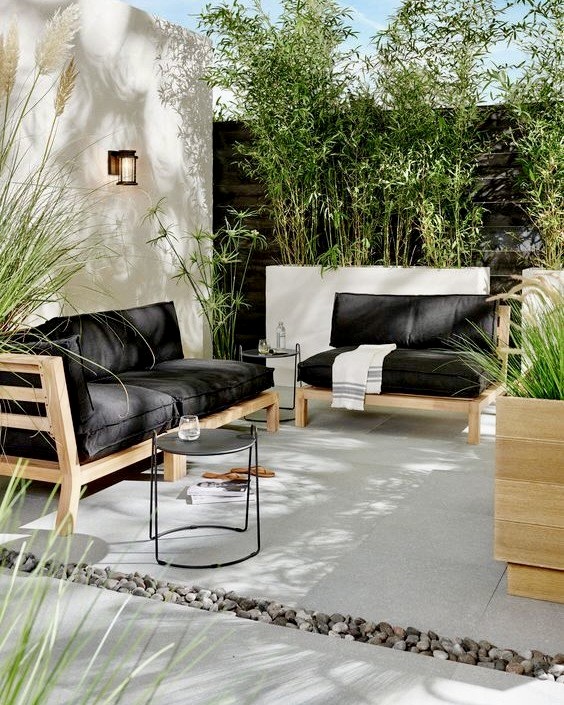 This stylish modern patio blends clean architectural lines with natural greenery, using bamboo and tall grasses to create a sense of privacy without losing softness, making it perfect for backyard relaxation. The smooth concrete flooring keeps the layout polished and uncluttered, while the black cushions and pale wood frames offer a refined contrast that feels both elevated and serene—an inspiring option for homeowners seeking ideas that lean into Scandinavian-inspired minimalism.