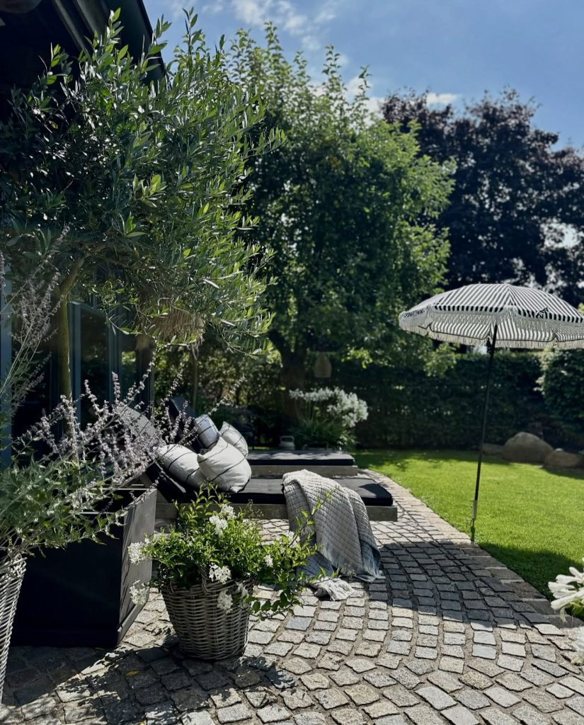 This charming patio blends timeless elegance with playful accents, featuring a scalloped umbrella that adds softness to the greenery-filled setting and helps define the outdoor seating zone. The mix of ceramic planters, patterned pillows, and textured tables creates a collected look that feels personal and welcoming—perfect inspiration for enhancing a front garden area or turning a small backyard corner into a curated escape. It’s a lovely reminder that character often comes from details rather than large structural changes.