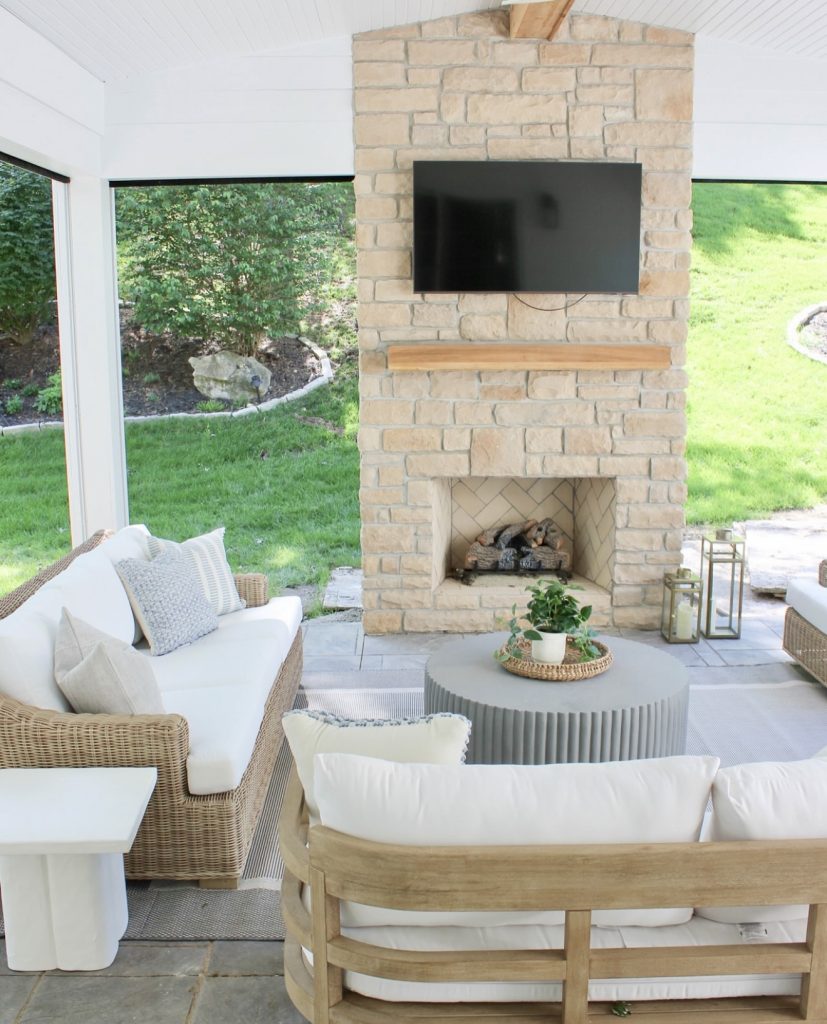 This beautifully covered patio centers around a stone fireplace topped with an outdoor TV setup, creating an entertainment-ready space perfect for year-round enjoyment. The woven seating, light wood tones, and soft cushions make the entire layout feel comfortable yet refined, while the surrounding greenery enhances the cozy atmosphere—an excellent example of ideas for backyard living that blend comfort, convenience, and natural charm.