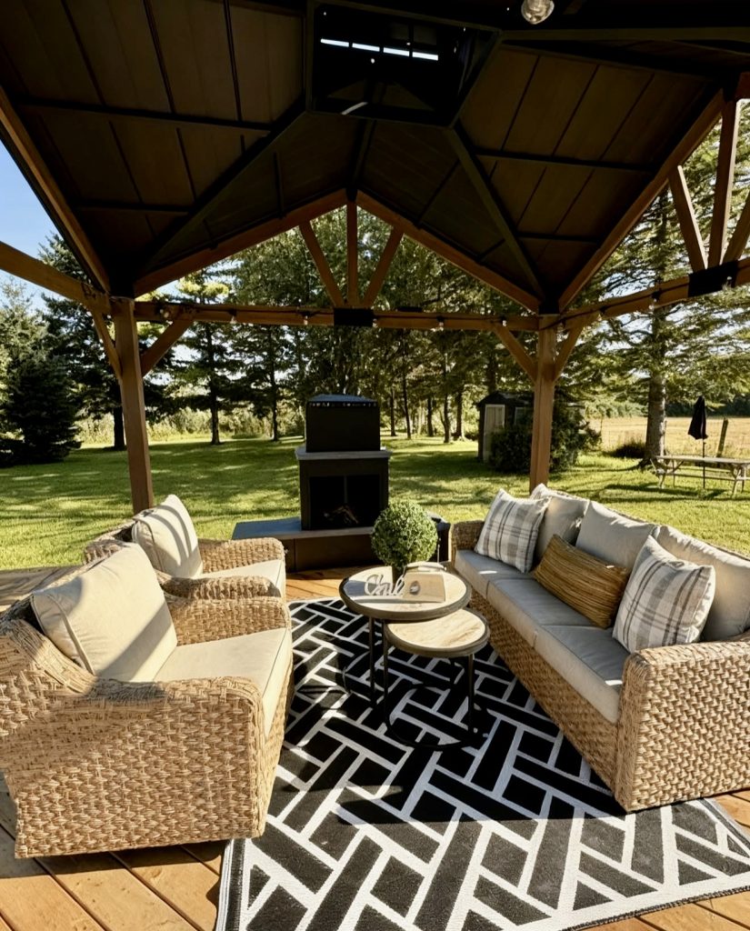 This open-air pavilion blends rustic charm with modern comfort, pairing a sturdy wooden structure and sweeping views of the surrounding landscape with woven seating and a bold patterned rug that anchors the entire outdoor setup. The airy layout makes it ideal for larger backyard properties where gathering spaces need to feel grounded yet open, and the central fireplace adds a cozy focal point for cool summer nights—perfect inspiration for anyone interested in practical, stylish ideas for backyard entertaining.