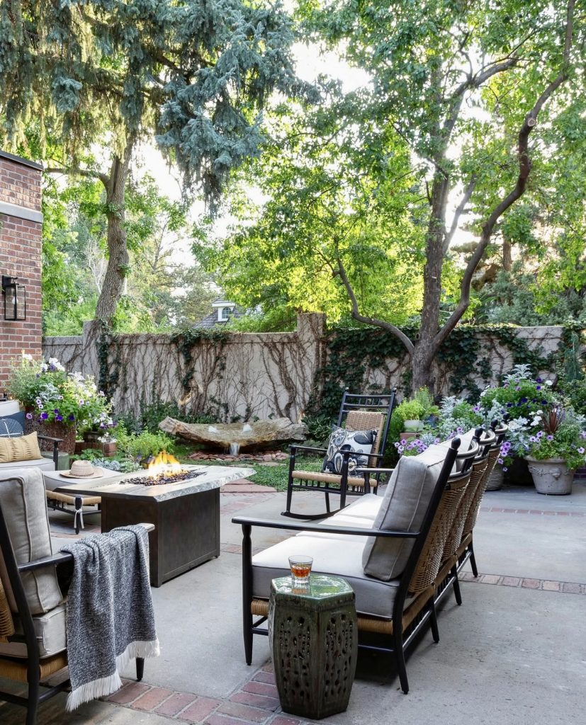 This lush patio mixes brick, greenery, and a sleek fire table to create a setting that feels both timeless and welcoming—a refined example of how layered textures can elevate a backyard without major reconstruction. The generous seating encourages long conversations, while the surrounding planters soften the concrete pathways and add natural dimension to the layout, offering warm and approachable ideas for homeowners who value comfort and charm in their outdoor spaces.