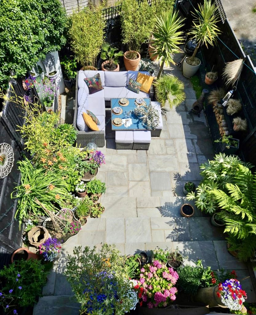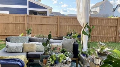 This small backyard patio is full of life and style and has an inviting, garden-like feel because of the vibrant tropical plants and the bold greens of the cozy sectional. The paved flooring holds the plants in and structures the area, while the compact dining and sectional furnishings show how foundational layout in even small outdoor patios can feel layered and full of distinct character. This is a patio vision perfect for anyone in the backyard design 2026 market looking for a bright and lively layered outdoor design.