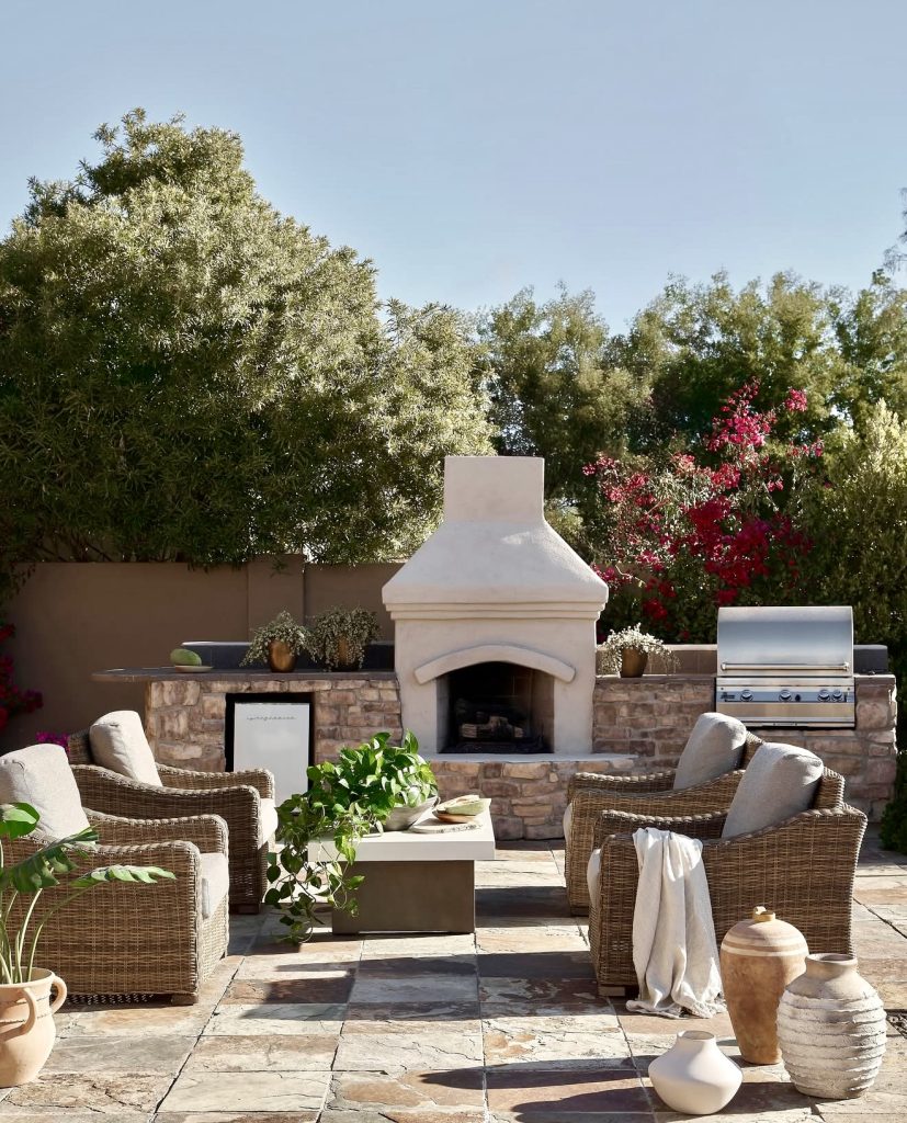 This rustic-inspired outdoor area embraces natural textures through its impressive stone fireplace, earthy seating, and flagstone flooring, giving the space a warm, grounded character ideal for year-round use. The combination of woven chairs, handcrafted pots, and a built-in grill makes it a versatile backyard environment that offers both function and atmosphere, especially for those seeking ideas that merge comfort with elevated classic charm—including room nearby for an outdoor hot tub area if desired.