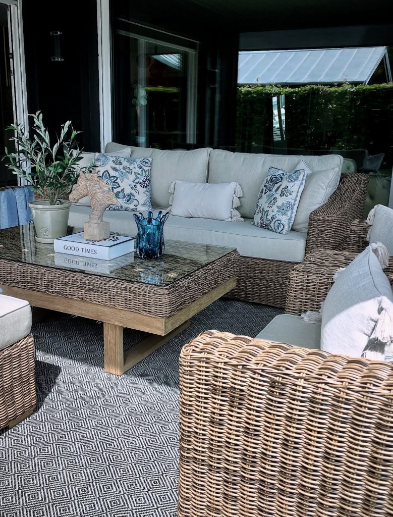 This inviting lounge setup brings a relaxed, coastal energy with its woven wicker seating, soft neutral cushions, and glass-topped coffee table that reflects natural light beautifully, making it ideal for a covered porch or shaded back patio. The layered textiles and patterned rug add a polished warmth that feels effortlessly livable, showing how comfortable design can elevate even a small backyard seating area while keeping the overall layout clean and functional for everyday lounging or weekend entertaining.