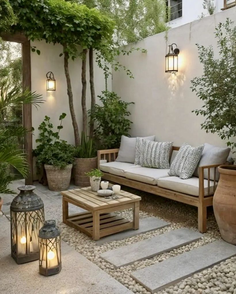 This quiet retreat feels like a private sanctuary thanks to its soft greenery, sculptural trees, and warm lantern lighting that casts a gentle glow across the stone-and-pebble flooring, a beautiful alternative to heavy concrete or full paver surfacing. The wooden bench and matching table keep the space grounded in natural textures, making it a thoughtful choice for those looking for ideas for backyard spaces that offer calm, intentional design—especially in tight areas where a smart layout transforms a small backyard into a serene escape.