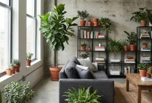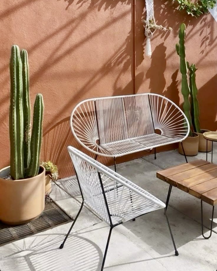 This sun-washed patio brings a breezy Southwestern vibe through terracotta walls, sculptural cacti, and airy white seating that plays beautifully with the shadows, making it perfect for both rooftop patios and compact outdoor corners. The streamlined furniture and warm tones show how a simple layout can create a stylish, low-maintenance environment, especially for homeowners who want modern ideas grounded in earthy textures without leaning on heavy stone or concrete elements.