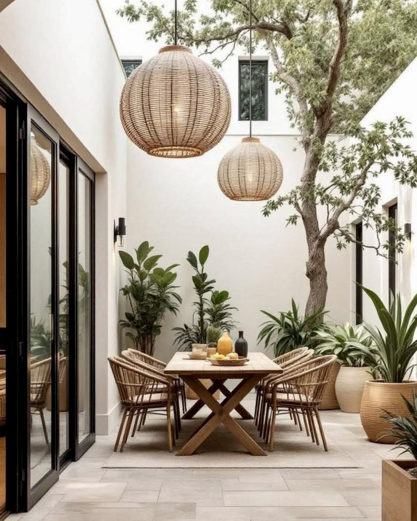 This outdoor dining area is a perfect combination of classic and contemporary because of the incorporation of organic elements, which is a design trend these days, and of soft architecture rattan light fixtures, a solid wood dining table, and outdoor dining greenery, and the atmosphere is reminiscent of modern times. The design is a great one for gatherings because of the roomy nature of the design and how there is an illusion of an endless space. The design paved the way for how an outdoor and indoor space can seamlessly blend and served as a calm and wonderful backyard gathering idea for many. The neutral stone flooring is an admirable fine detail and brings a classy touch to the design. An airy layout is a remarkable design trait and a great example for those seeking an elegant design.