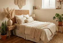This eclectic mix of vintage and boho elements creates a warm and inviting space. The unique patterns on the sofa paired with the rich textures of the throw and pillows provide a comforting, laid-back atmosphere. The soft lighting filtering through the window complements the room’s earthy tones, making this room a perfect retreat for someone who appreciates a mix of vintage charm and modern bohemian style.