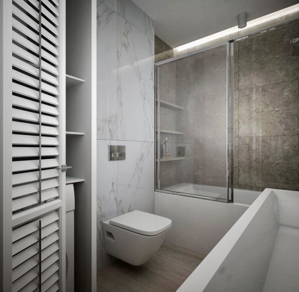 Every little space makes a difference when the space is tight. The small bathroom proves that clean style and vertical use of space are a winning combination. Every feature in the bathroom, including the wall-hung toilet and tub-shower combo, is designed with proportions in mind. Adding storage shelves in this position does not interrupt the room. Even in a little space, the marble-like walls give it a classier, neat appearance, which is great for apartments or finished basements.
