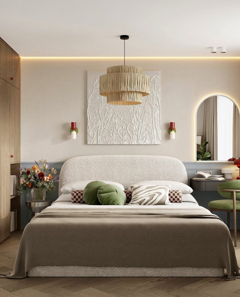 This bedroom design embraces modern luxury with a playful twist, mixing rounded furniture and layered pillows in earthy tones. The textured wall art above the bed adds depth, while the chandelier introduces a unique touch of craftsmanship. Pops of green in the cushions and chair bring freshness, making the space ideal for small rooms that need personality without clutter. The balance of neutral bedding with bold accents makes this design feel stylish yet approachable. It’s the kind of aesthetic you might expect in a boutique hotel, blending comfort with creativity.