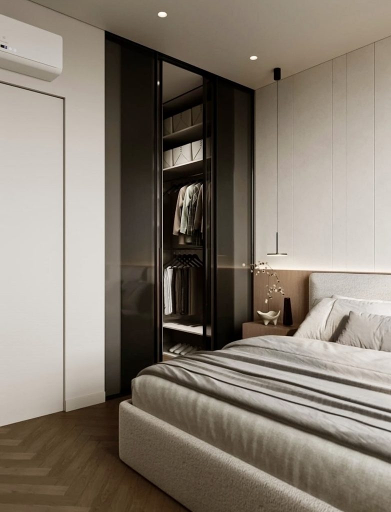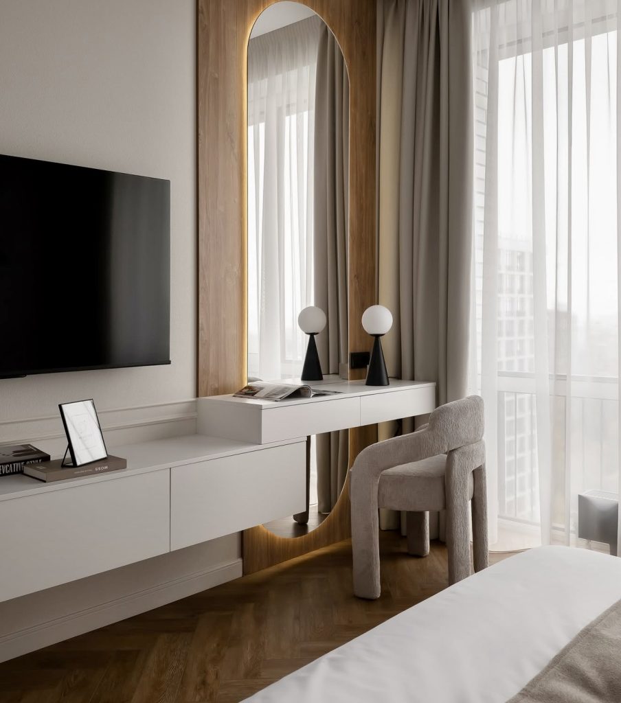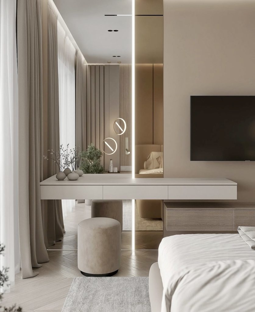 This design highlights the importance of personal space, with a built-in vanity that brings a touch of modern luxury into the bedroom. Neutral tones and integrated lighting make the area feel polished and stylish while still being highly functional. The clean lines of the floating desk and stool create a sense of lightness, perfect for couples sharing the space. Large mirrors amplify the feeling of openness, making them a clever idea for small rooms. It’s a unique example of how everyday routines can be elevated into something truly aesthetic.