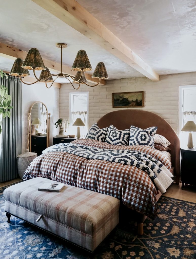 This bedroom captures the essence of modern luxury through a rustic lens. The warm wooden beams and woven lampshades bring a sense of traditional craftsmanship, while the layered bedding—mixing plaids and geometric prints—adds a unique visual rhythm. A soft ottoman at the foot of the bed and a luxury chandelier elevate the space with hotel-like comfort. The overall effect feels both classic and stylish, offering a cozy sanctuary that could easily belong in a countryside boutique retreat.