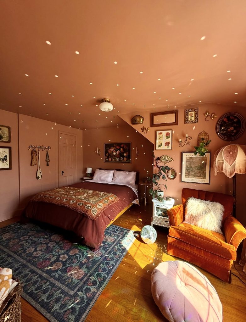Playful, nostalgic, and deeply personal, this design radiates a bohemian spirit that feels straight out of Stardew Valley. The dusty rose walls and disco ball reflections create a dreamy, aesthetic glow, while the velvet armchair and embroidered blanket infuse royal vintage warmth. It’s a space that celebrates individuality—layered with art, plants, and sentimental details. Perfect for creative souls who want their bedroom to feel like a daily escape into a unique world of imagination.