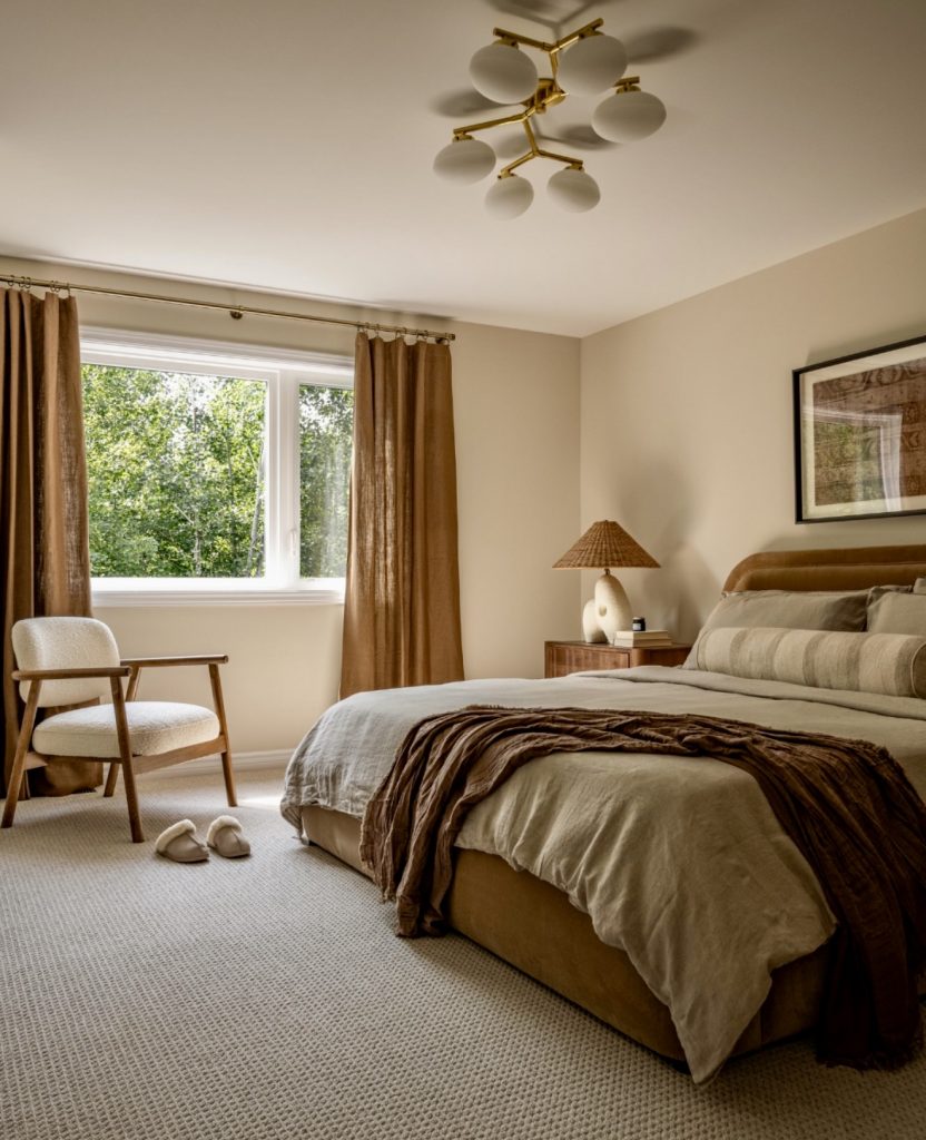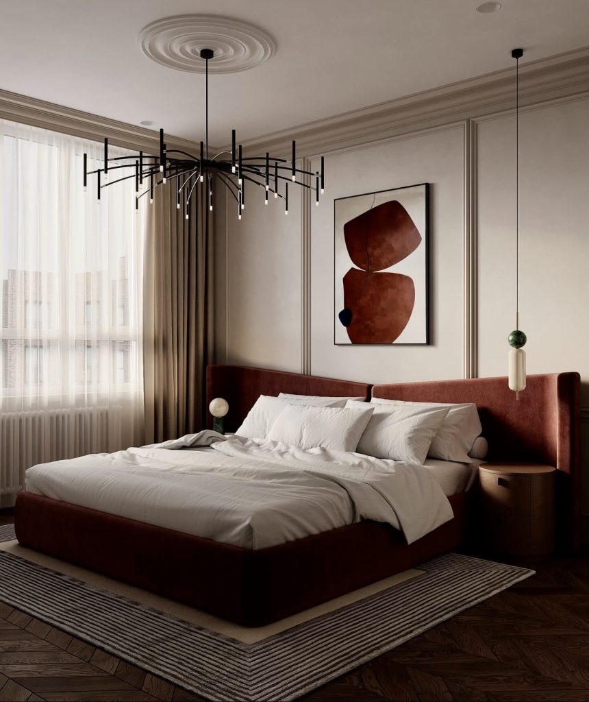 This bedroom makes a statement with its deep burgundy bed frame set against creamy walls, achieving a contemporary yet elegant look. The oversized black chandelier contrasts sharply, adding an industrial edge while still feeling chic. Abstract wall art ties the palette together, proving that bold color can feel both modern and timeless. The overall mood is warm and inviting, the kind of luxury you’d expect in a designer hotel. It’s a space that demonstrates how the latest interiors embrace contrast for maximum impact.
