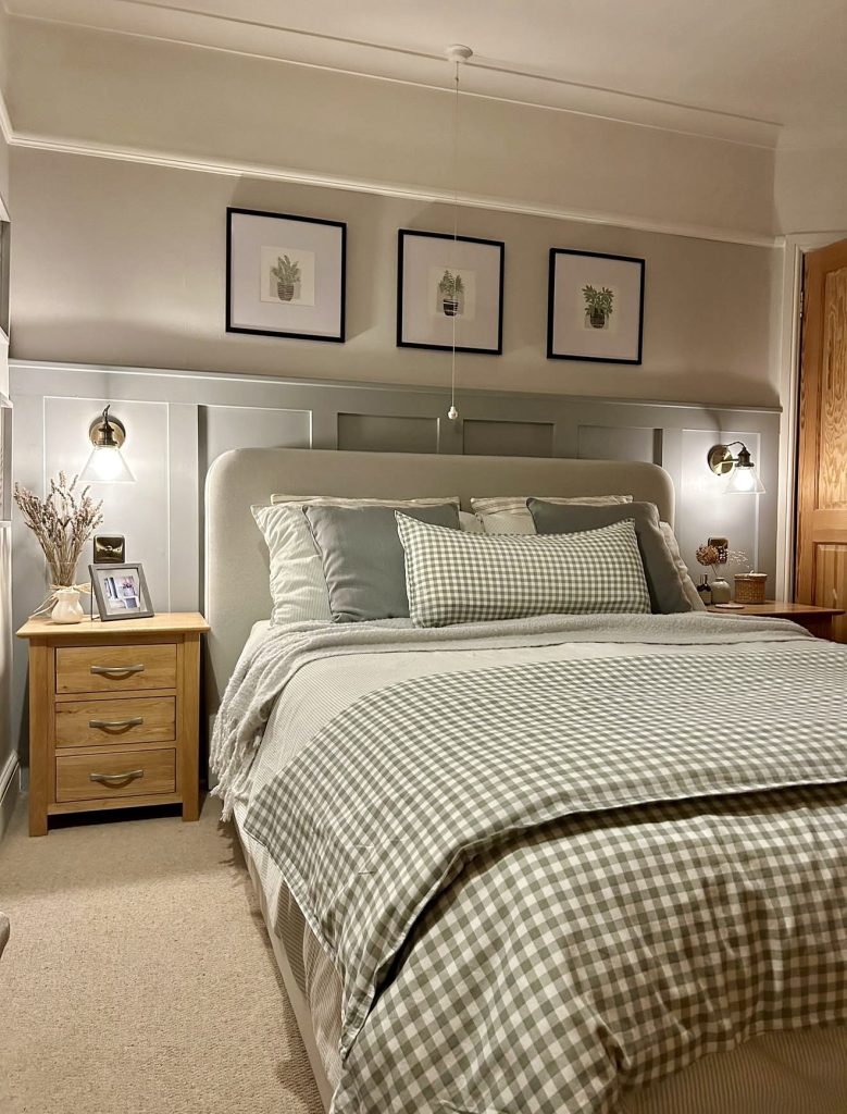 Perfect for small rooms, this bedroom design has the charming small-space look with no sacrifice to style. The gingham print on the bed has a retro feel while staying modern, with a touch of cozy cottage appeal that translates to fresh space decor for modern homeowners. The light gray walls, soft furnishings, and botanical prints offer a fresh balance that makes it timeless yet on-trend. This is one of those fabulous designs that one has to see to understand: that great taste has nothing to do with space—it has to do with good styling and adding warmth with one’s own touch.