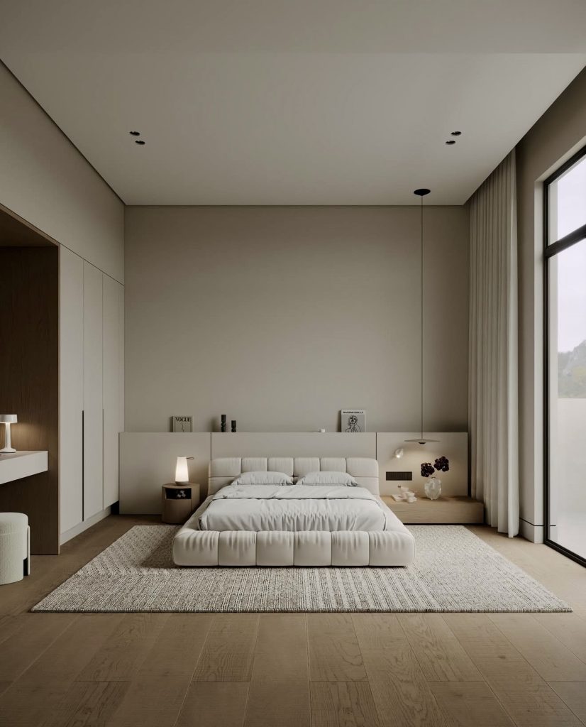 Embracing the minimal trend, this bedroom exemplifies the latest approach to clean, calming design. A low-profile platform bed, soft neutrals, and a large picture window maximize openness, proving that tiny rooms can feel spacious with intentional design. This modern sanctuary suits both urban apartments and nature-view homes, bringing together form, function, and peaceful simplicity. Inspired by Japandi balance, it shows how thoughtful restraint creates the most lasting impression.