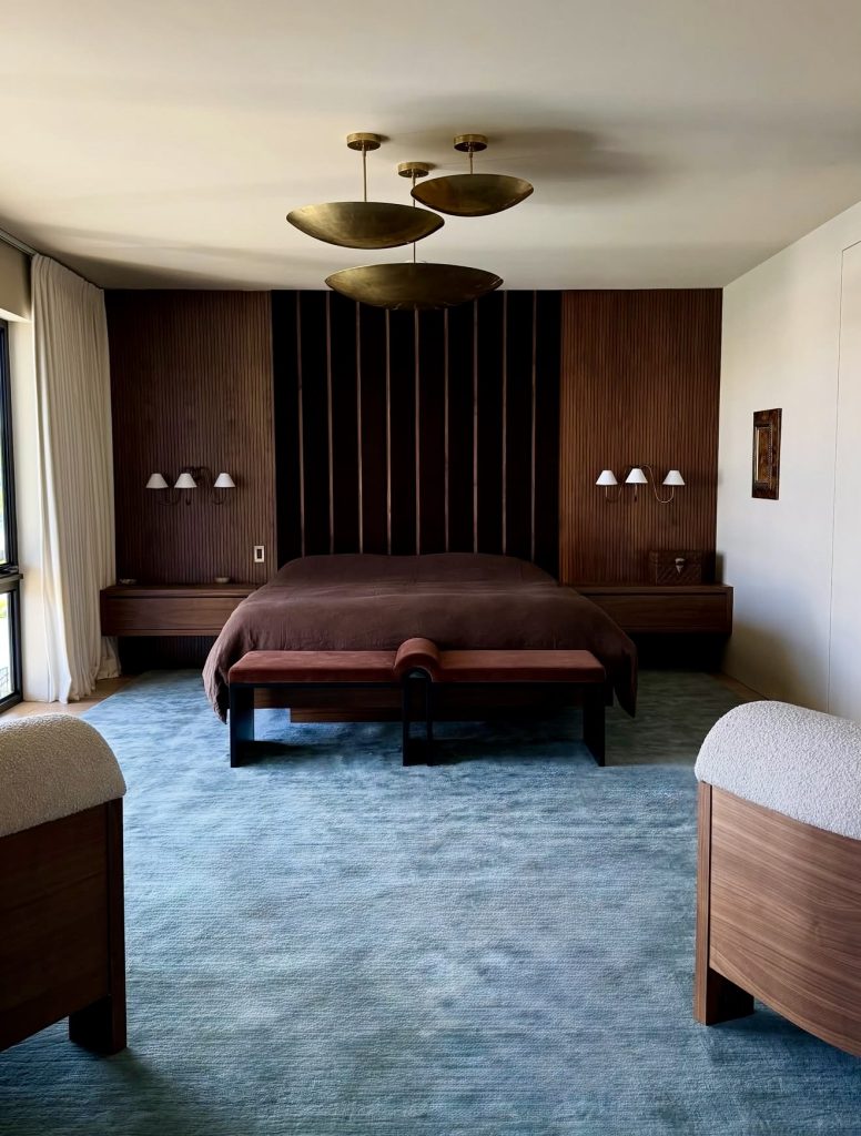 This striking contemporary bedroom reimagines royal luxury with a 1970s-inspired flair. The rich brown palette, ribbed wooden paneling, and sculptural brass lighting evoke a sense of cinematic drama. Deep textures and symmetry make this design feel luxurious yet livable—ideal for those who appreciate unique character in their interiors. It’s bold, confident, and perfect for anyone drawn to the industrial-meets-modern aesthetic that’s defining high-end interiors in 2026.