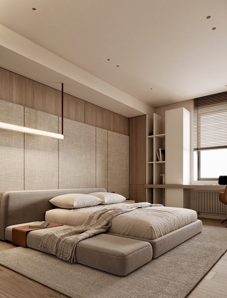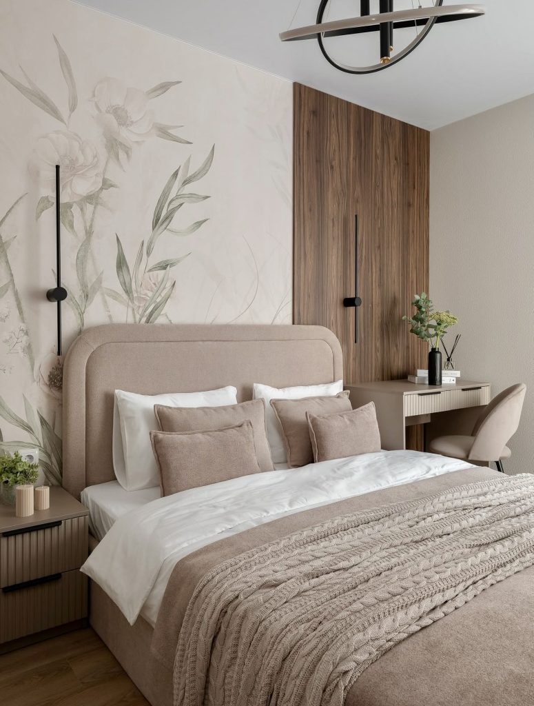 Warm beige tones and soft textures define this inviting bedroom that feels both classic and elegant. The floral mural adds a romantic atmosphere, while the knitted blanket creates a sense of warmth perfect for small spaces. A streamlined desk tucked to the side shows how thoughtful planning can work for couples or anyone balancing work and rest. The neutral palette enhances a minimal yet welcoming ambiance, proving you don’t need excess to feel luxurious. This design feels timeless yet modern, an amazing choice for anyone seeking calm, retreat-like interiors.