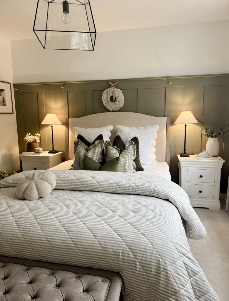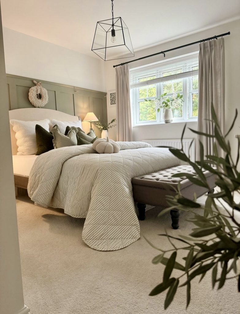 Drenched in sunlight, this stunning bedroom shows off tradition with a light touch and modern flourish. The wainscoted walls, tufted bench, and subtle striped and textured fabrics offer it a sophisticated, regal quality with cozy warmth to match. The dramatic black pendant light introduces modernity to perfection, while natural light complements every soothing color in the space perfectly to make it an epitome of comfort with poise—luxury without extravagance.