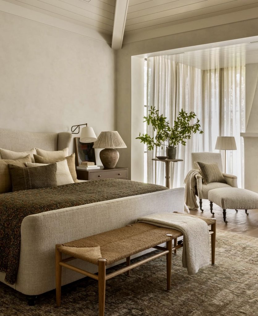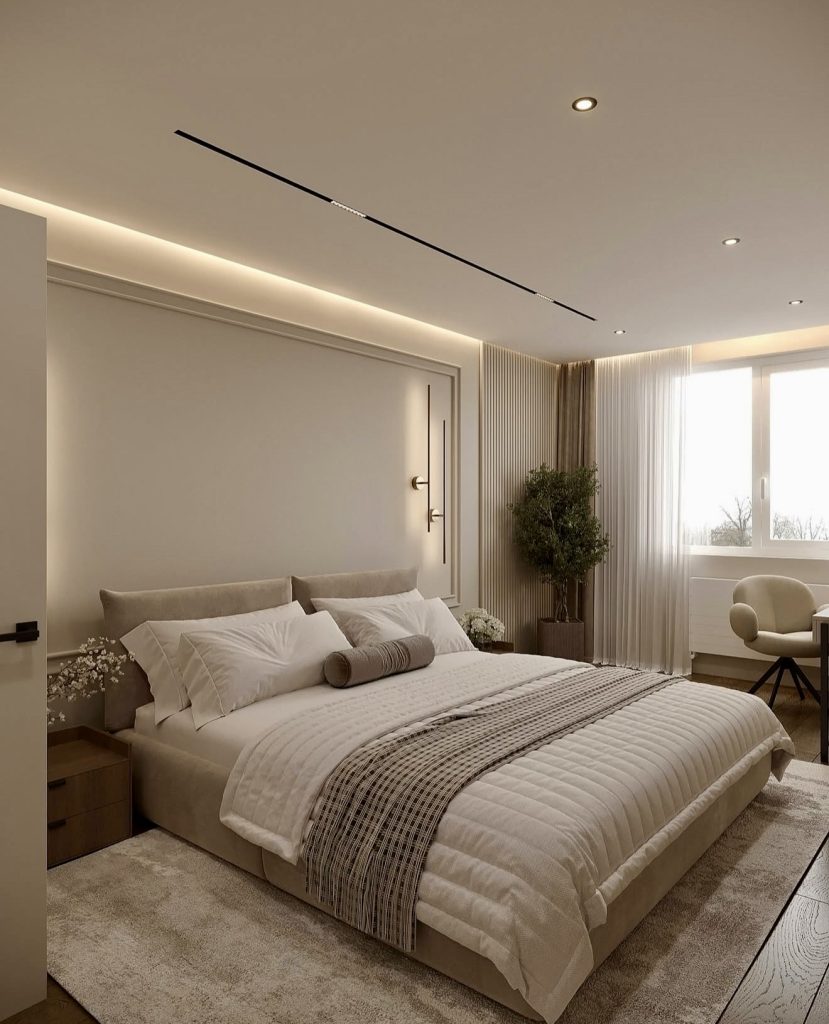 This bedroom defines modern luxury through subtlety. The warm taupe walls, classic paneling, and layered neutral tones create a deeply elegant retreat that feels like a five-star hotel suite. Twin armchairs with striped pillows add a conversational touch, while botanical accents introduce organic calm. Every detail—from the framed artwork to the tailored bedding—balances royal sophistication with cozy intimacy, making it a timeless design for couples who crave serenity and understated style.