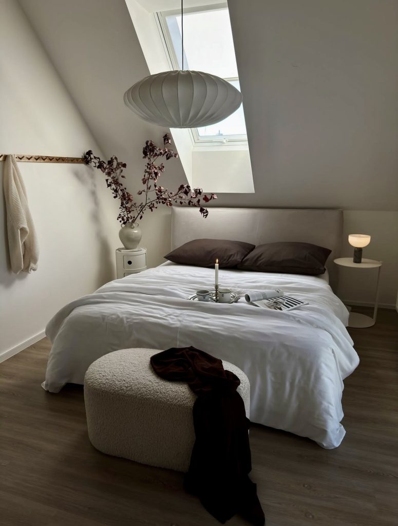 The serene attic bedroom is designed to be aesthetically minimalist with thoughtful styling to keep it simple yet beautiful to the core. The natural light cascading from the skylight reduces sharpness in minimalist walls and simple beds to give them an understated quality to complement the natural light cascading in it, giving them an effortless touch of Scandinavian simplicity and Japaneseness—transcendental serenity being the most timeless sophistication in 2026 interiors to come.