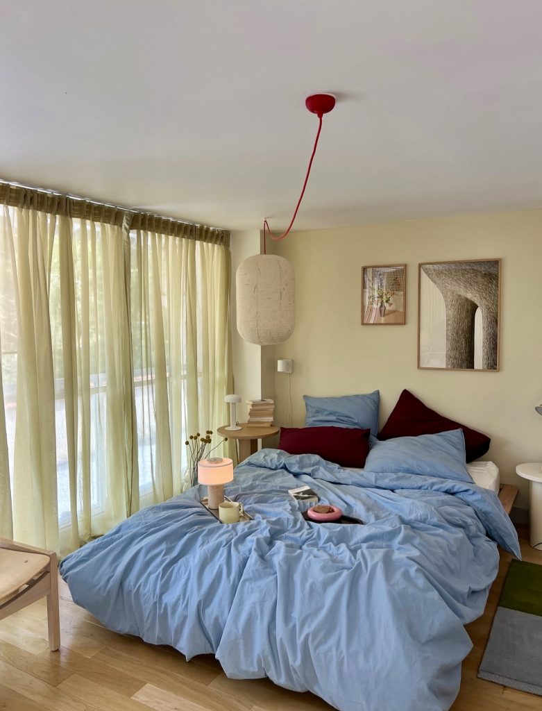 Here, aesthetics meets authenticity. This modern bedroom blends mid-century furniture with crisp white walls, creating a light-filled retreat perfect for small rooms. The curated art, layered linens, and touches of greenery make it feel personal and lived-in—like an apartment in Brooklyn or Berlin. It reflects the latest interior philosophy: that true luxury lies in comfort and individuality. This is city living with heart and soul, without any pretense—just style and simplicity in perfect balance.