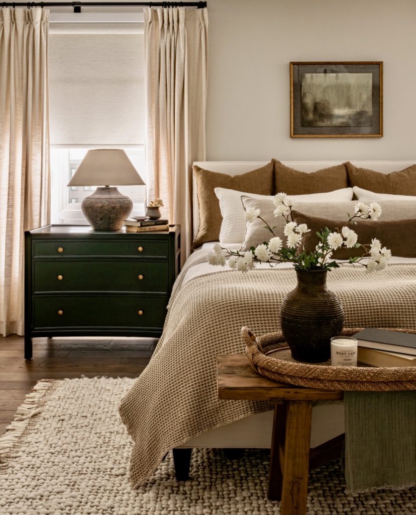 This modern bedroom installation takes the best out of nature with immense comfort and serenity in it. The natural installation with light maintenance provides immense comfort with serenity in it, while the spacious natural light installation makes it divine with immense depth in it. It is the best combination of Japandi minimalism and modern artisanship—where nothing is unnecessary and everything promotes comfort. The woven bench and natural color scheme represent the latest trend: earthy sophistication with a timeless and human touch.