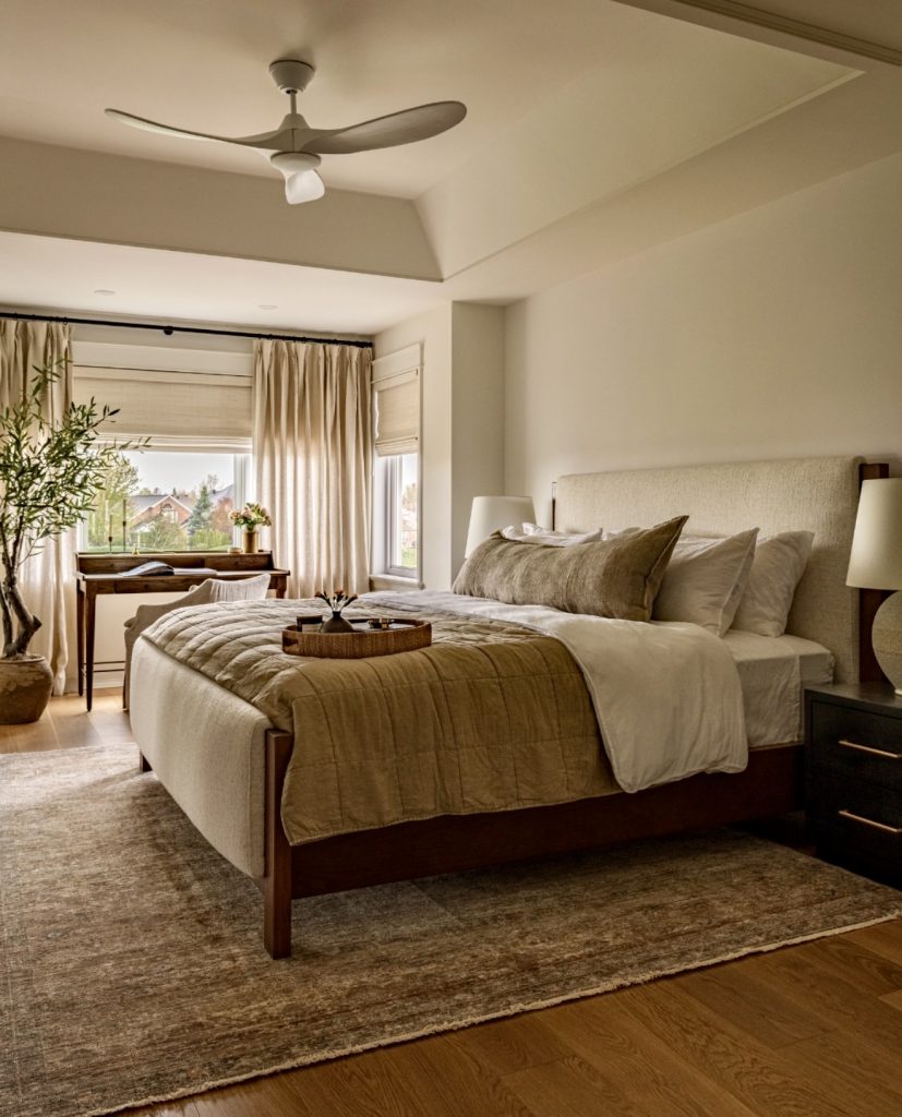 This beautiful bedroom shows the best blend between the soothing effect of earthy shades perfectly incorporated with natural textures—best defined in the latest trend in minimalist bedrooms in 2026. The unique ceiling fan installation with natural wooden furniture emits strength in subtle modern decor, while natural linen gives it relaxation hints in every detail. While stylish enough to qualify it to work in any upscale hotel room or even in any upscale real estate property around the world, it combines the very best of what makes it connected to being in “home” in terms of designing for couples who prefer to remain in serene seclusion in 2026.