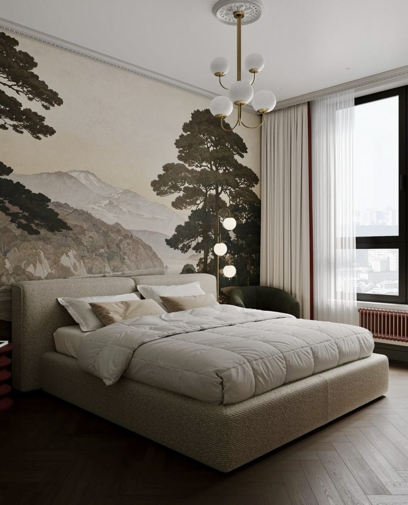 The bold mural of trees and mountains instantly sets a unique and contemporary tone in this bedroom. Paired with a textured bed frame and clean bedding, the space balances drama with modern comfort. A brass chandelier and globe lights bring in a touch of royal luxury, making the room feel artful and expressive. The design works beautifully for small rooms by using the wall as a focal point instead of heavy decor. This interior feels like an amazing mix of traditional artistry and modern minimalism.