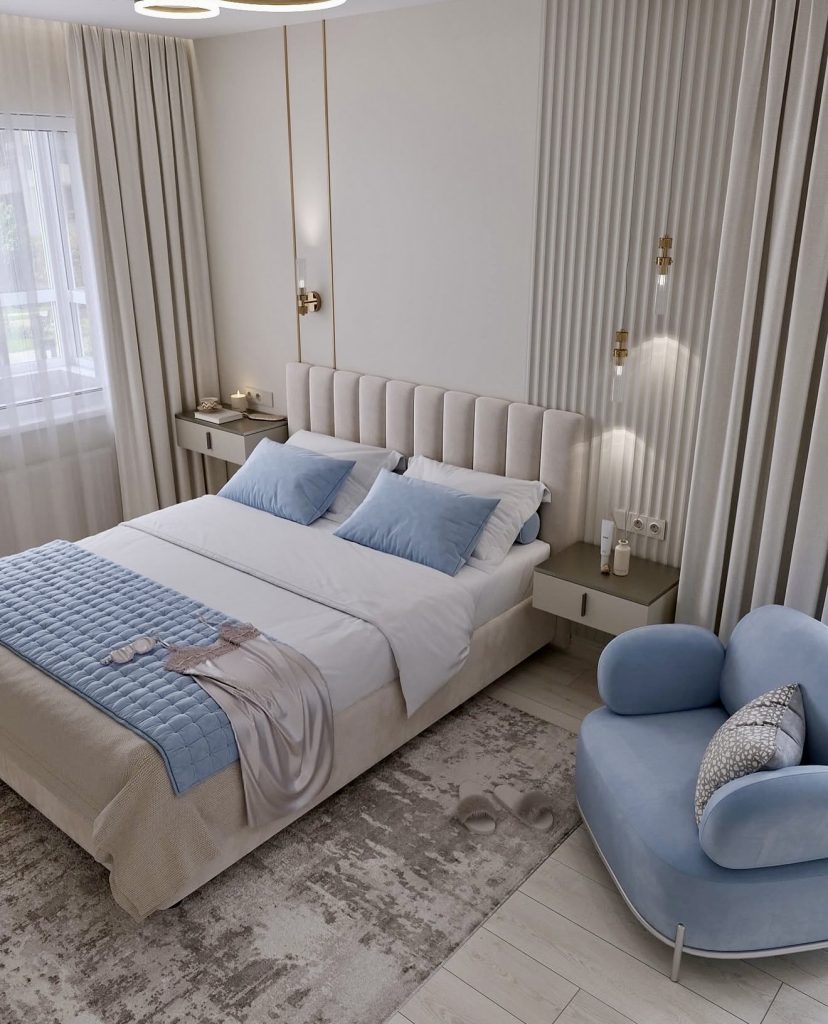 Blue tones take center stage here, proving why they’re a favorite in aesthetic and stylish bedroom designs. The upholstered bed and matching lounge chair in soft blue create harmony and freshness, perfect for couples seeking serenity. Neutral walls and gold lighting details add a layer of modern luxury, elevating the overall mood. This look is ideal for small rooms, where lighter colors can make the space feel larger and airier. It’s a unique yet timeless idea that feels both calming and chic.