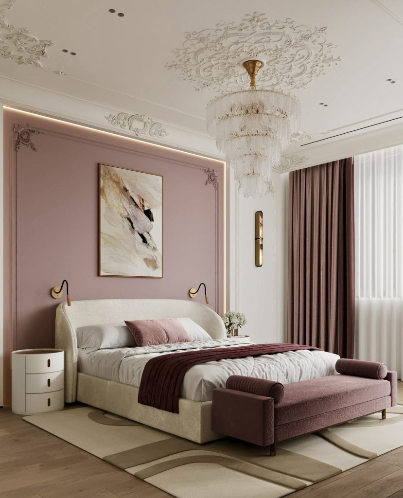 This bedroom is the definition of royal luxury, with ornate ceiling details and a cascading chandelier that feels straight out of a palace. The muted mauve walls paired with rich velvet accents create a stylish and intimate atmosphere. The symmetry of the bed and side tables ensures balance, while the bench at the foot of the bed adds functionality. Soft textures keep the space warm, even within its grandeur, making it work beautifully for couples who want a sophisticated retreat. It’s a perfect blend of classic charm and modern comfort, proving that romance in interiors never goes out of style.