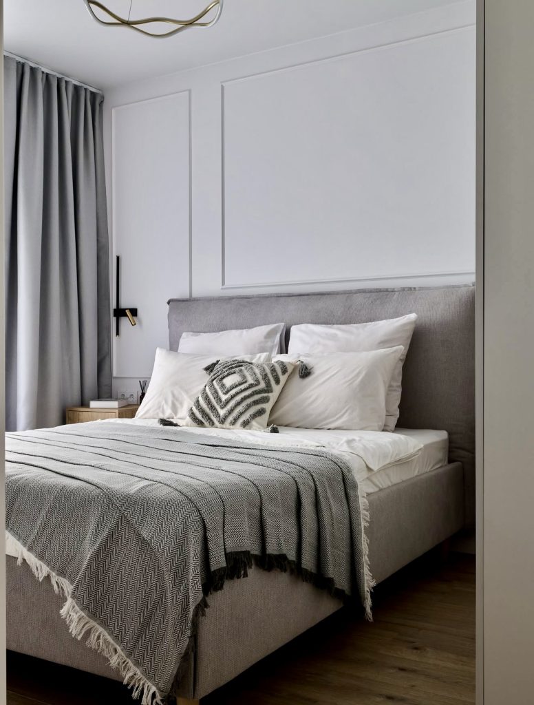 Here’s a tiny bedroom that doesn’t sacrifice comfort for size, with clever choices making the most of limited square footage. A gray palette enhanced by a geometric pillow keeps the look stylish and coordinated. The tall curtains draw the eye upward, giving the illusion of more space and creating an elegant frame for the bed. Simple wall molding adds depth without overwhelming, ideal for small spaces that need character. This design shows how amazing style can thrive even for small rooms if each element is chosen with care.