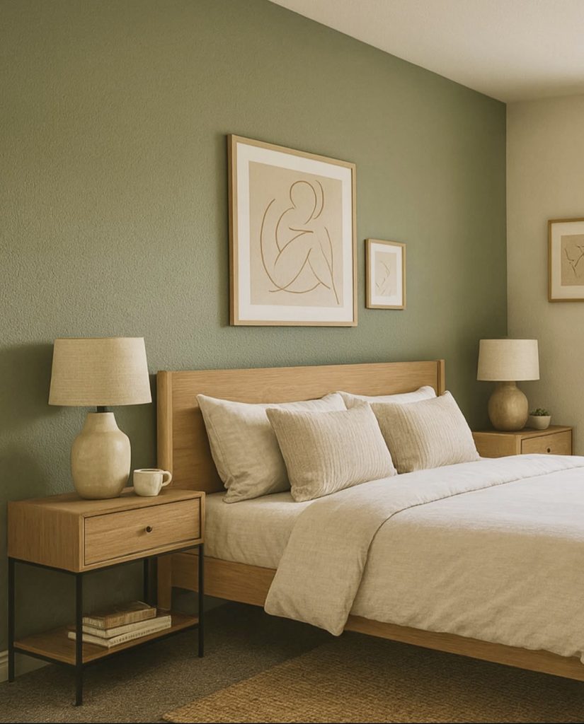 This design embraces the calming presence of a sage green accent wall paired with natural oak furniture. The neutral bedding, ceramic lamps, and minimalist artwork create an aesthetic that feels effortlessly cozy yet polished. It’s a great source of inspiration if you’re seeking ideas for small rooms, since the look relies on clean lines and light, breathable textures rather than bulky furniture. Adding a slim nightstand with books or a coffee cup also makes the space feel lived-in and inviting. For anyone who loves earthy tones, this design shows how to balance natural warmth with modern minimalism.