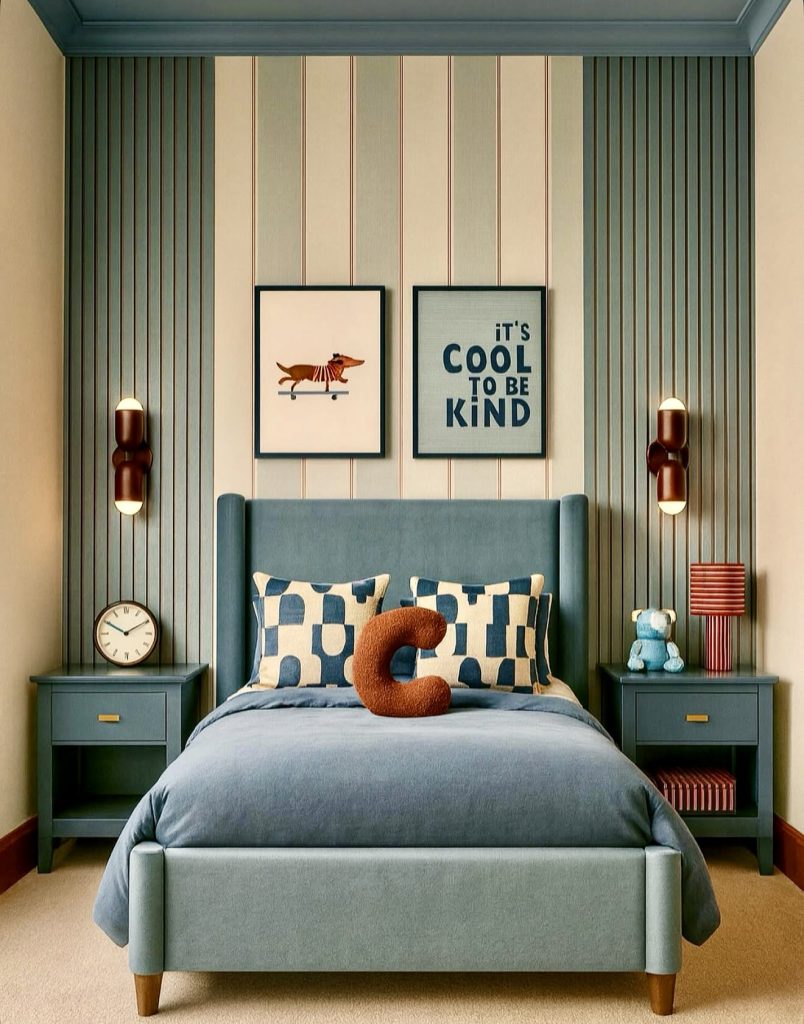 This bedroom proves that blue can be both youthful and chic. The patterned pillows and striped wallpaper inject a lively rhythm into the space, while posters on the wall add a touch of personality. Balanced sconces and matching nightstands keep the layout symmetrical, which makes the design feel intentional and polished. The interior is playful enough for kids or teens, yet sophisticated enough for adults who love bold room ideas. If you’re on the lookout for aesthetic ideas that blend fun with function, this design is a great reminder that color can be classy without being overwhelming.