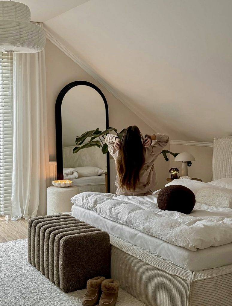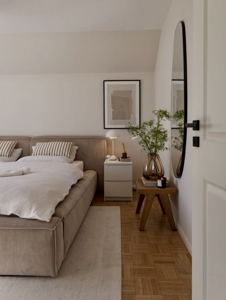 This bedroom embraces Japandi principles, mixing simple forms with warm textures. The oversized floor mirror, sculptural stool, and layered bedding create a cozy haven under sloped ceilings, making it a strong contender for ideas for small rooms. The muted palette of whites and browns feels earthy, while the candles and soft light elevate the aesthetic into something more intentional. For those seeking inspo in creating a tranquil retreat, this design highlights how thoughtful room decor—like rounded mirrors and textured stools—can transform awkward spaces into serene sanctuaries.