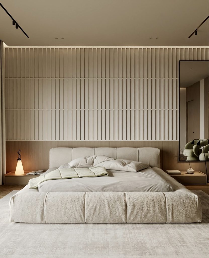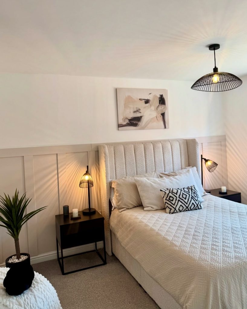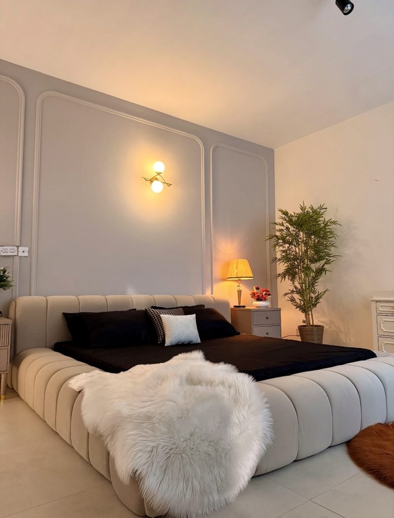 This bedroom thrives on contrast. A tall upholstered headboard and paneled wall add structure, while sleek black side tables and lamps bring in a moody undertone. It’s the absolute best combination of refined class and functional interior design. The patterned cushion adds a splash of personality, and the geometric lighting fixtures provide the modern kick. For homeowners scouring for design ideas that marry softness and edginess, this look proves that a simple bedding setup can definitely benefit from intense accents. This can only be categorized as interior design that aptly finds the middle ground.