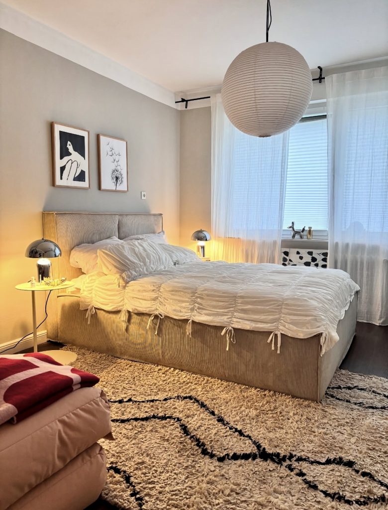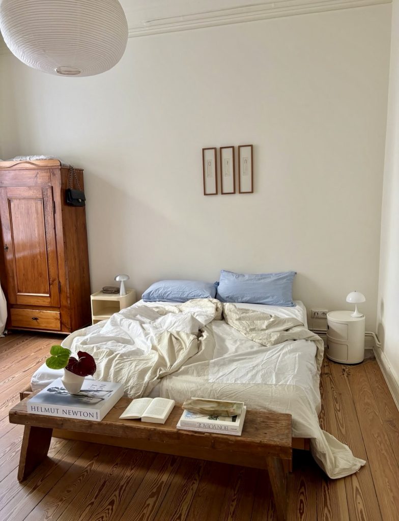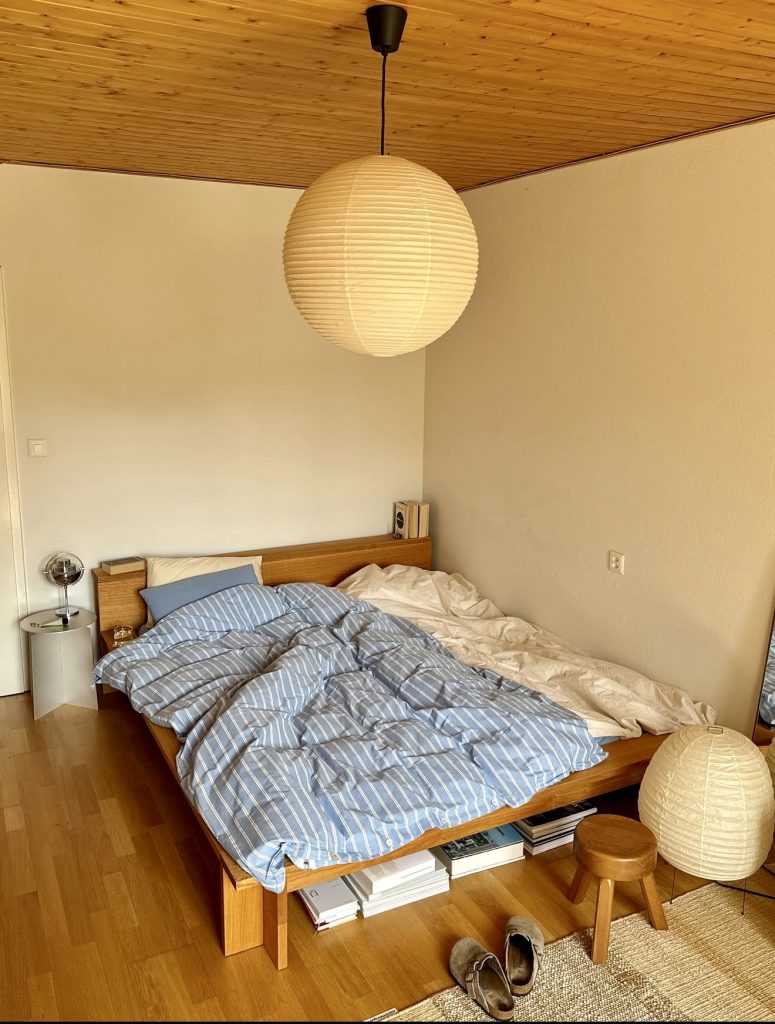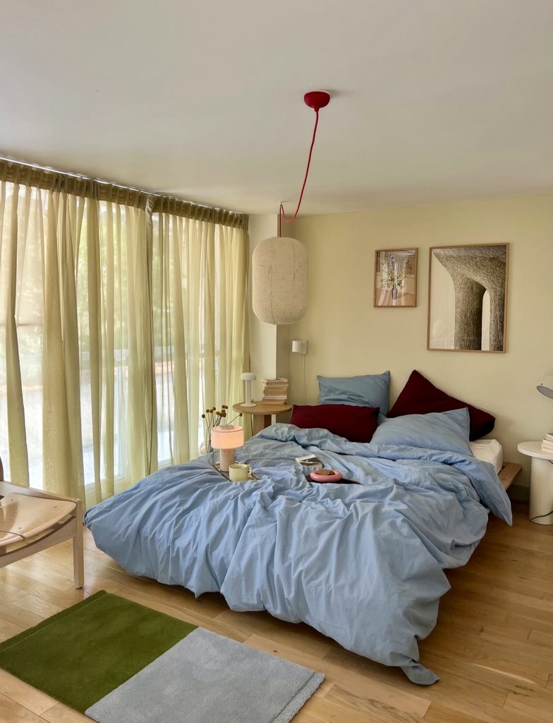 For a lighter, youthful vibe, this room leans into posters on the wall instead of traditional artwork, setting a casual but stylish tone. The all-white bedding and paper lantern lamp add a fresh, Japandi-inspired atmosphere—simple yet warm. A wooden sideboard and floor in a herringbone pattern introduce contrast and depth, while the green plant brings in an earthy touch. This is a great option for city apartments where room decor must stay practical but still inspire. For those looking for inspo in creating multifunctional bedrooms—think studying, relaxing, and entertaining—this design proves that pared-back doesn’t have to mean plain.