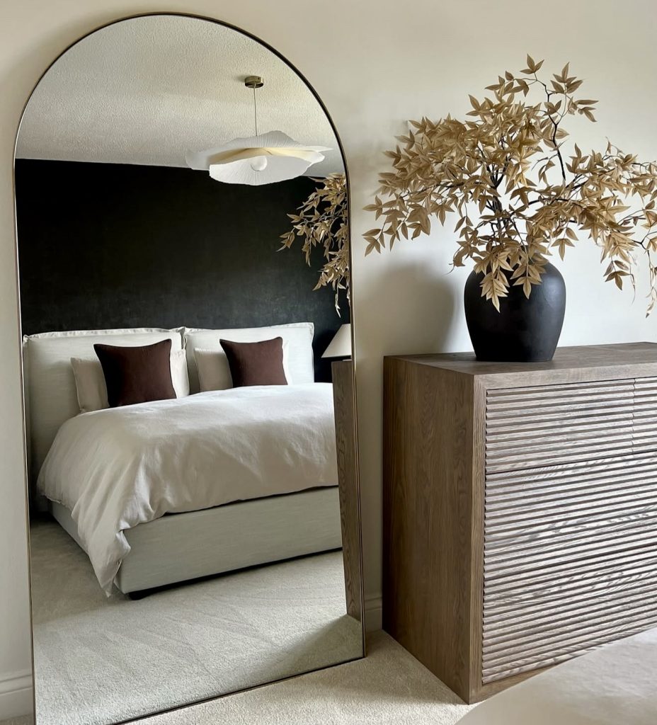 Here, the drama lies in the contrast. The deep charcoal accent wall acts as a bold backdrop for crisp bedding and rich brown pillows, delivering a distinctly moody and luxurious look. The oversized arched mirror reflects light and expands the sense of space, while the sculptural dresser and vase add classy room decor details. It’s a design that leans toward modern luxury yet keeps itself grounded with earthy elements like dried foliage. For those considering wardrobe design or vanity ideas that work in dramatic interiors, this setup proves that bold doesn’t have to feel heavy.