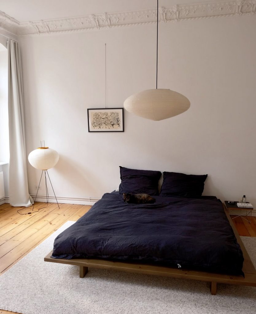 This setting clearly portrays the benefits of home decor that’s minimal. The room has a low wood frame for the bed, accentuating white walls along with paper lamps that look incredibly moody. This design offers strong aesthetic ideas for urban apartments, where less furniture can make a room feel more spacious. The subtle posters on the wall add character without overwhelming the clean lines. It’s a great example of how restraint in design can lead to a bold statement that feels timeless.