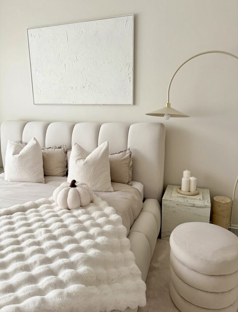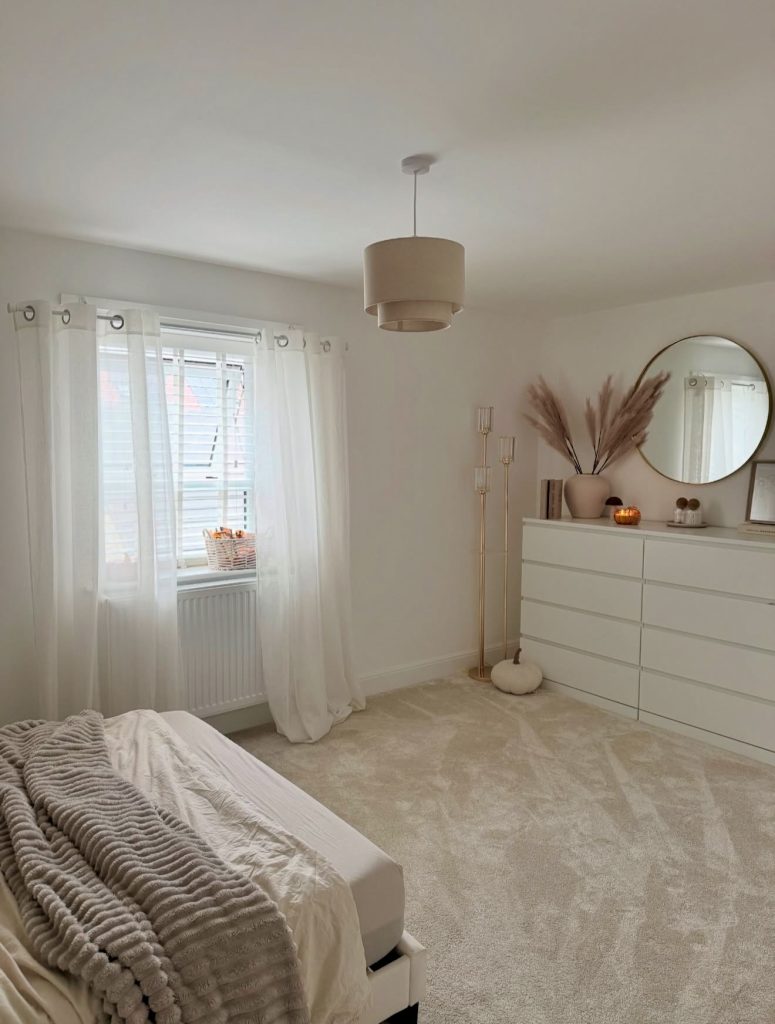 This bedroom embraces lightness with layers of white and beige, creating a bright and cozy retreat. The round mirror above the dresser adds visual interest while amplifying light, a trick often recommended by interior experts like Amber Lewis. Pampas grass, candles, and gold accents provide just the right amount of aesthetic room decor, striking a balance between trendy and timeless. Perfect for those who love ideas for small rooms, this design proves that working with a restrained palette can still feel luxurious and calming.
