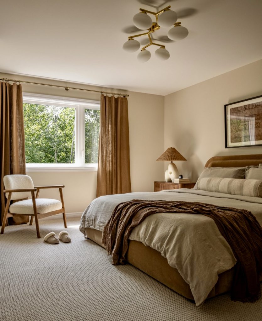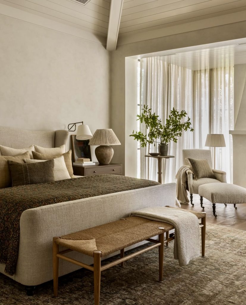 This cozy master retreat blends earthy neutrals with tailored simplicity. Linen drapery filters soft light across textured bedding, while natural wood benches and handcrafted ceramics reinforce a grounded sensibility. The muted palette and clean lines evoke a Japandi calm—perfect for anyone seeking slow-living inspirations. Add greenery or organic pottery to mirror this look, keeping your room ideas cohesive and timeless.