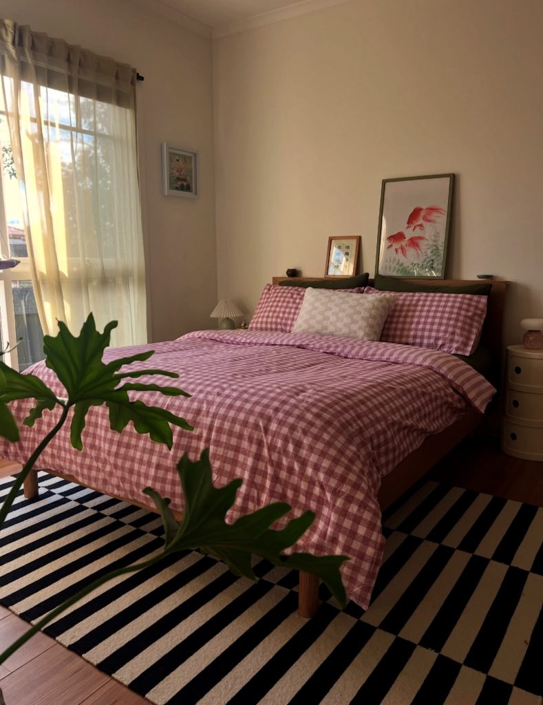 A burst of nostalgia reimagined for 2026, this bedroom turns a modest layout into cheerful comfort. The pink gingham bedding adds youthful aesthetic charm, proving that ideas for small rooms don’t need to sacrifice style. A striped rug introduces contrast and rhythm, while casual art leaning on the headboard creates approachable decor ideas. It’s coastal-meets-retro with a wink—a playful inspo for renters who want personality without permanence.