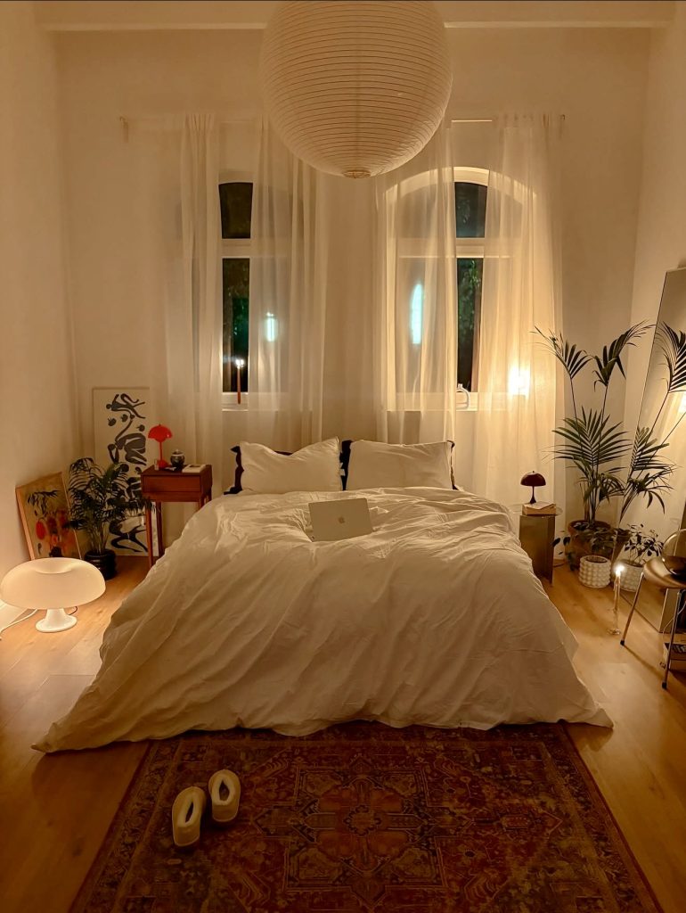 This aesthetic soft refuge for the eyes presents indulgence through its simpleness. The billowy bedding, lighting, and paper lantern provide gentle movement, while the abstract paintings provide graphic contrast to soften its monochromatic look. This modern interpretation of Scandinavian serenity in Japandi’s demeanor is just what every stylish lover searching for decor that whispers, not yells, deserves!” To recreate its dwelling, add plush decor and warm lighting.